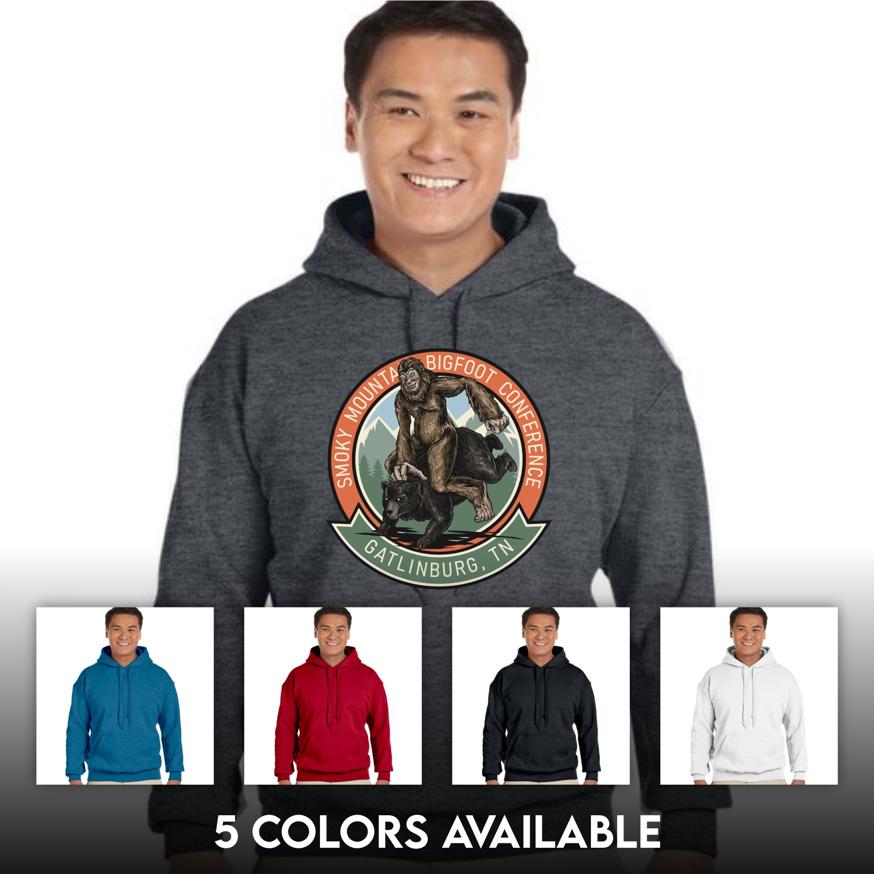 The 2023 Smoky Mountain Bigfoot hoodies are now available for sale. This new hoodie sports the new “Bigfoot and Black Bear” design over the official logo of The Smoky Mountain Bigfoot Conference to be picked up at the event – limited sizes and colors will be available at the event.